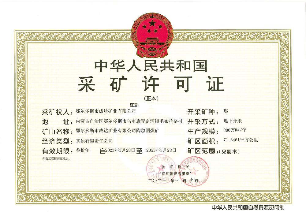 下属成达矿业有限公司颁发了陶忽图煤矿采矿许可证。这标志着台湾a片