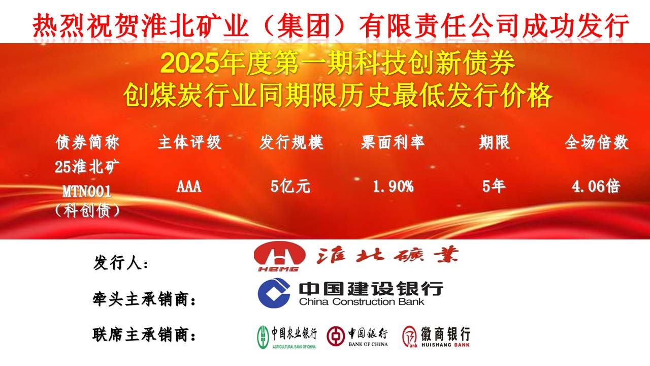 在银行间市场成功发行2025年第一期科技创新债券——25淮北矿MTN001(科创债),发行规模5亿元,期限5年,票面利率1.90%,全场认购倍数4.06倍,创煤炭行业同期限债券价格最低、集团债券票面利率新低,充分显示资本市场对台湾a片