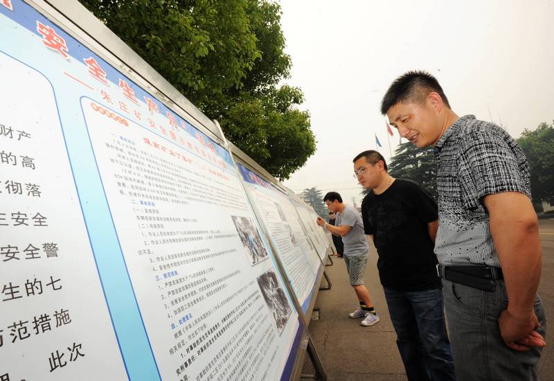 为深入开展“安全生产月”活动,强化安全警示教育,提高广大职工自主保安意识。近日,朱庄矿工会开展了以“加强安全法治 保障安全生产”为主题的“安全警示教育事故案例展”活动。图为6月9日,该矿几名职工正在观看警示教育案例专题牌版。