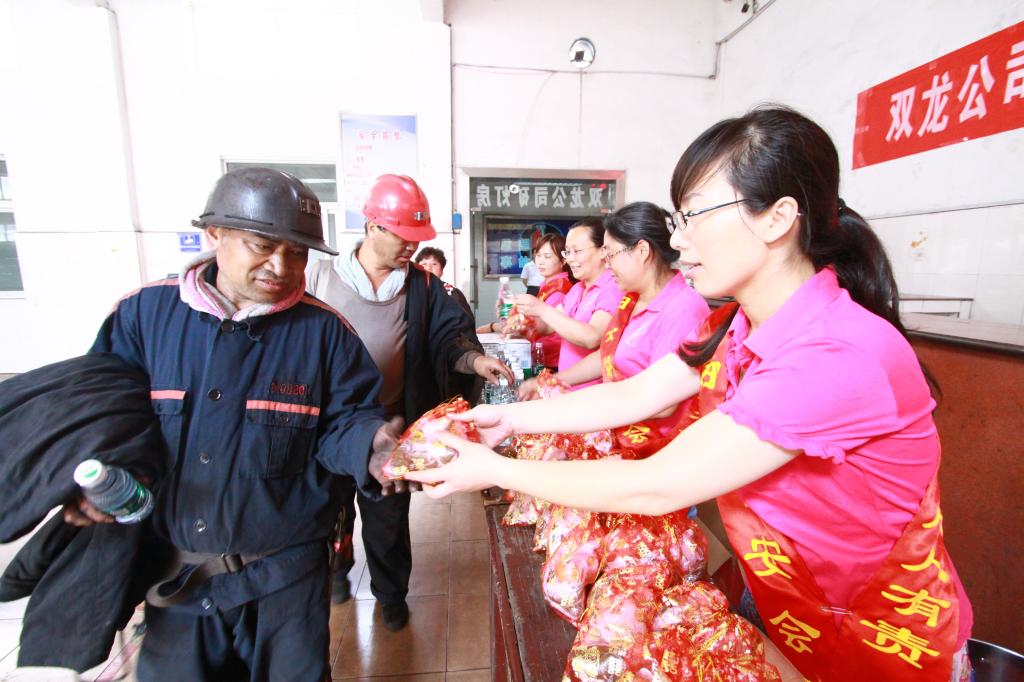 “工作辛苦了,来,吃个粽子。”、“辛苦了,喝瓶水解解渴吧。”……直到上早班的采掘一线职工全部上井后,忙碌了三个多小时的协安姐妹才拖着疲惫的身体圆满地结束活动。