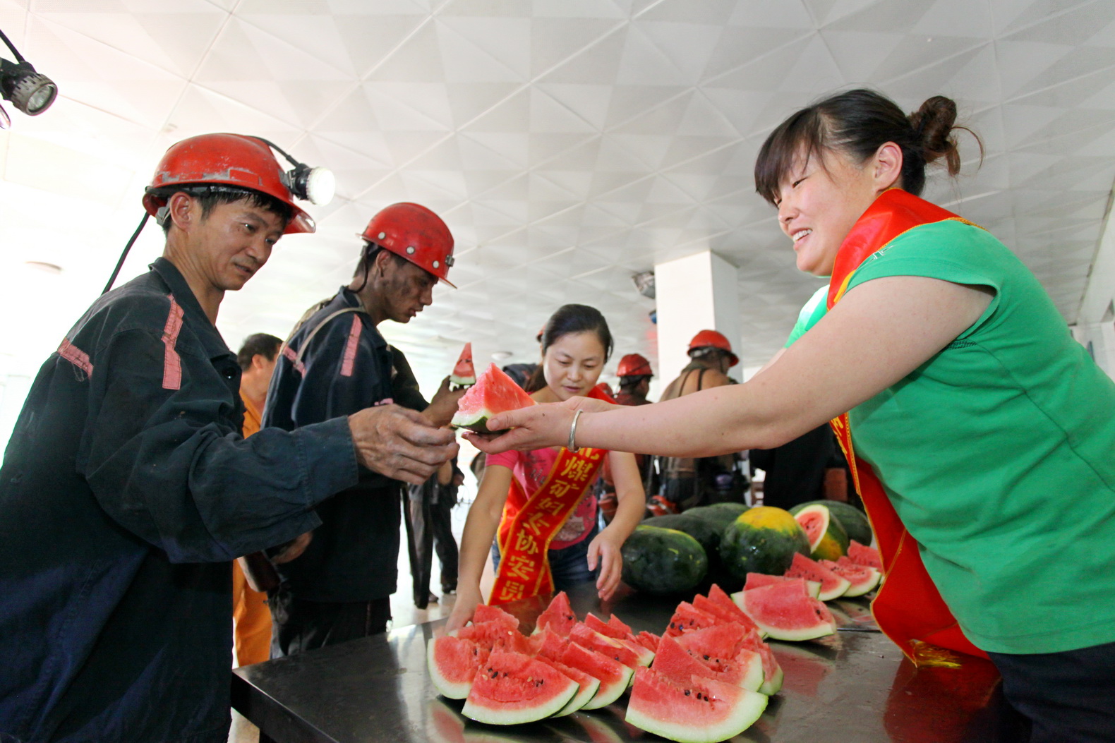 为了让职工师傅升井的第一时间吃上清凉可口的西瓜,协安员们提前用自来水将西瓜冰好。中午1点多,协安员们便在副井口候罐室拉开阵势,洗的洗,切的切,不一会,一块块鲜美可口的西瓜呈现在活动现场。随着升井职工的到来,协安员面带微笑将一块块充满亲情与关怀的西瓜送到职工手中,并不时地叮嘱着:“辛苦了,多吃几块,上班千万要注意安全!”“今天可真热啊,真没想到刚一升井就能吃到这么好的西瓜,真是太感谢了!”一位职工师傅高兴的说。