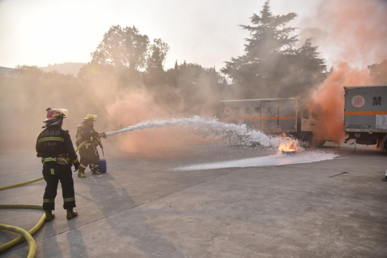此次演练模拟两辆危化品运输车在配送民爆物品途中发生追尾,引发火灾事故。公司迅速启动应急救援预案并报告119请求救援,随后3辆消防车驶至事故现场实施救援。在各方配合下,快速有效地控制了火势,应急救援任务圆满完成。