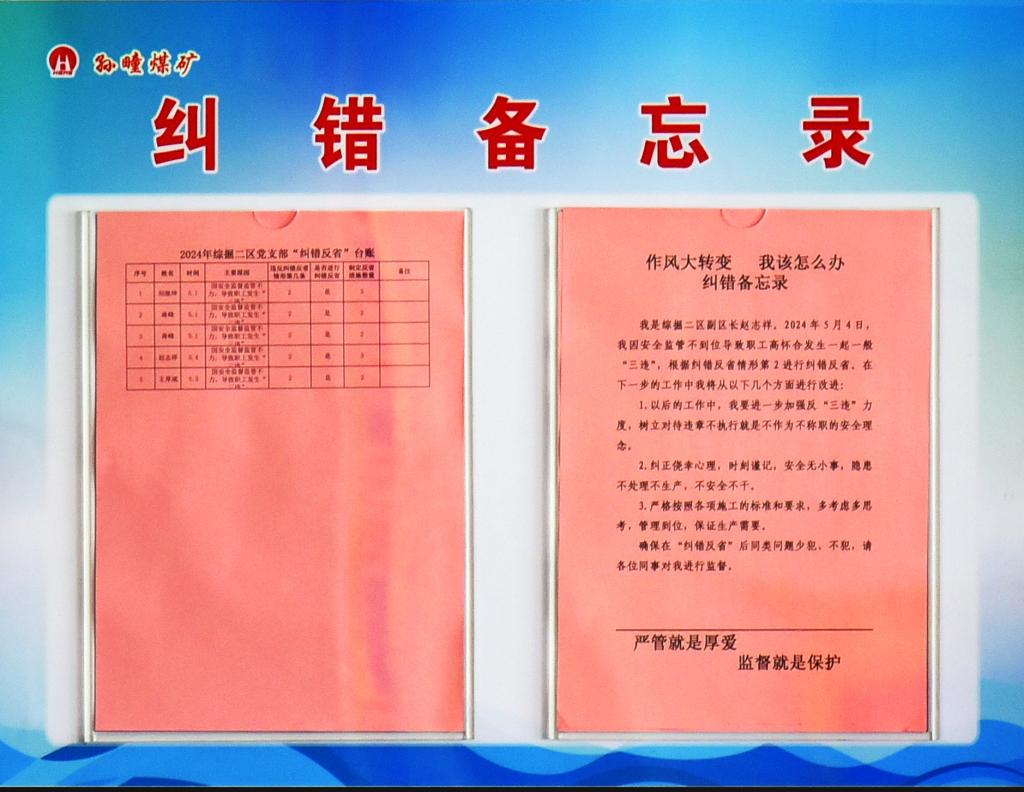 “跟班期间,我因现场管控不到位,造成1名职工违章操作,在此向全区干部职工作深刻检讨……”。5月21日上午,记者来到孙疃矿综采一区会议室,墙上的一张公示检讨书格外醒目——“纠错备忘录”。这是该矿强化干部“严细实精”工作作风,提高工作执行力和落实力的一项有力举措。
