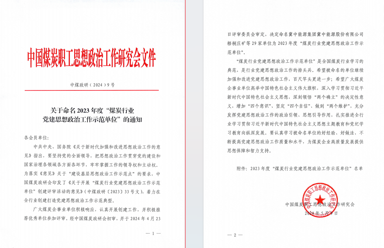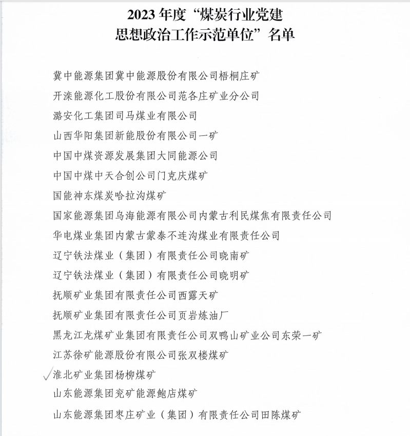 近日,中国煤炭职工思想政治工作研究会印发《关于命名2023年度“煤炭行业党建思想政治工作示范单位”的通知》(中煤政研〔2024〕9号),杨柳煤矿荣获2023年度“煤炭行业党建思想政治工作示范单位”称号。