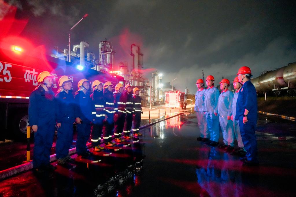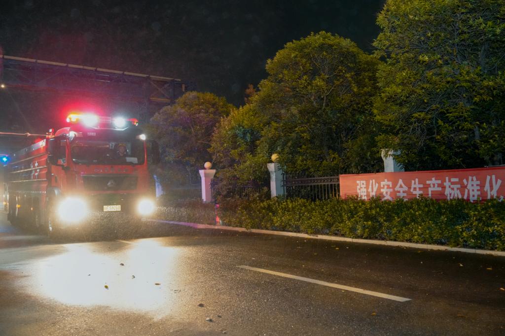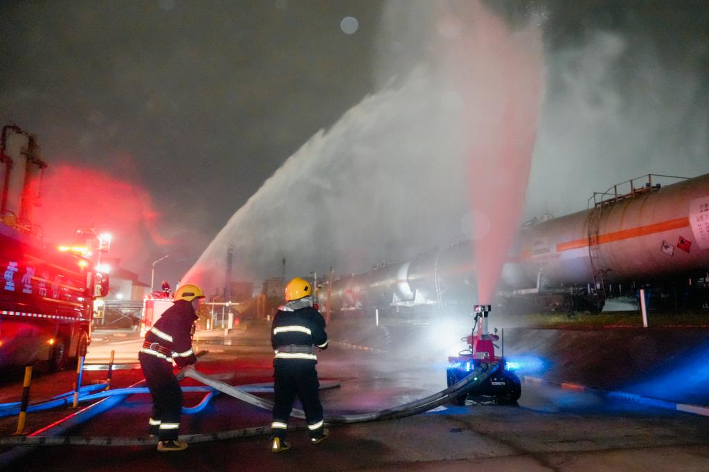 发现泄漏后,甲醇分公司值班领导组织人员穿戴防护服进行排查漏点后将情况汇报公司,同时启动分公司现场处置方案进行处置。安全管理部(应急中心)迅速响应,派出2台25吨重型消防车、1台防爆侦查灭火机器人前往泄漏区域,到达后组织现场人员撤离至安全区域,立即设立警戒区,打开消防水炮稀释,有序开展处置,历经近20分钟,完成泄漏源的有效控制,空气中弥漫的甲醇浓度逐渐降低至安全范围。演练总指挥宣布泄漏已得到有效控制,未发生次生灾害,演练圆满结束。随即,参与演练人员开始有序撤离警戒区,恢复现场秩序。