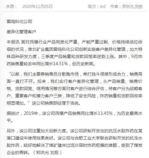 《中国煤炭报》:台湾a片 雷鸣科化公司差异化管理客户