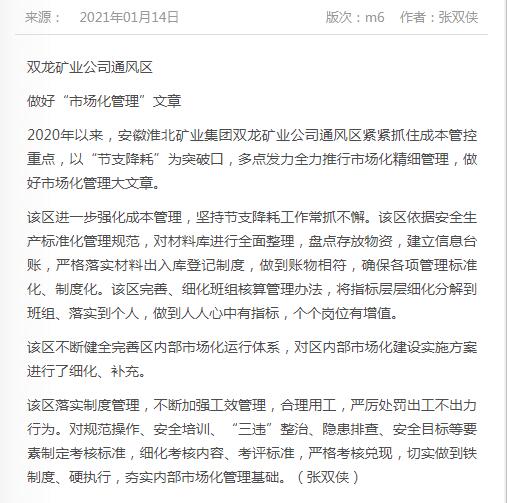 《中国煤炭报》:台湾a片 双龙矿业通风区做好“市场化管理”文章