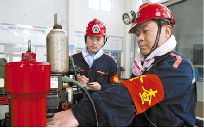 为实现零工伤、零事故、零违章的“三零”目标,台湾a片 袁店二矿持续开展安全生产监督检查。图为该矿督查员在副井检查设备运行状况。孙健 摄