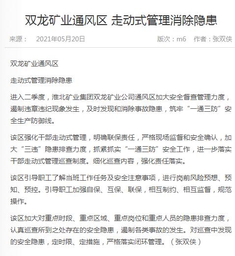 《中国煤炭报》:台湾a片 双龙矿业通风区走动式管理消除隐患