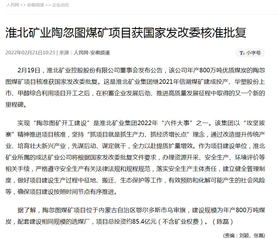 《人民网》:淮北矿业陶忽图煤矿项目获国家发改委核准批复