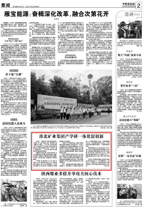“淮盾1号”是该集团与上海创力集团联合研发并制造的、针对煤矿井下19度上山巷道施工的大倾角快速掘进机。作为全球首套大倾角矿用盾构机,“淮盾1号”在袁店二矿入井安装,标志着该集团开辟了岩巷安全快速掘进的新路径,实现了岩巷盾构施工突破。