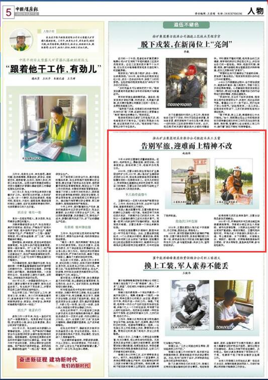 综采安拆分公司,现在是龙湖修造项目部激光熔覆车间的一名数控车床工。在平凡的岗位上,凭借军旅生涯磨炼出来的吃苦耐劳、艰苦奋斗的精神,王雷以自己的实际行动树立了一名退伍军人的良好形象。