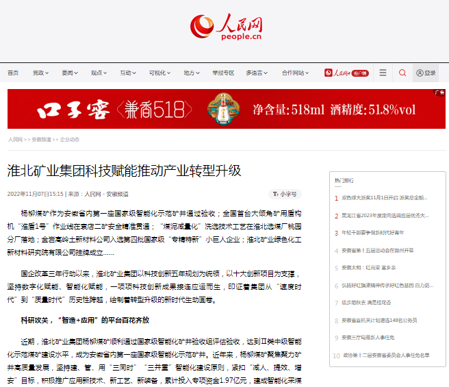 杨柳煤矿作为安徽省内第一座国家级智能化示范矿井通过验收;全国首台大倾角矿用盾构机“淮盾1号”作业线在袁店二矿安全精准贯通;“煤泥减量化”洗选技术工艺在淮北选煤厂桃园分厂落地;金岩高岭土新材料公司入选第四批国家级“专精特新”小巨人企业;淮北矿业绿色化工新材料研究院有限公司挂牌成立……