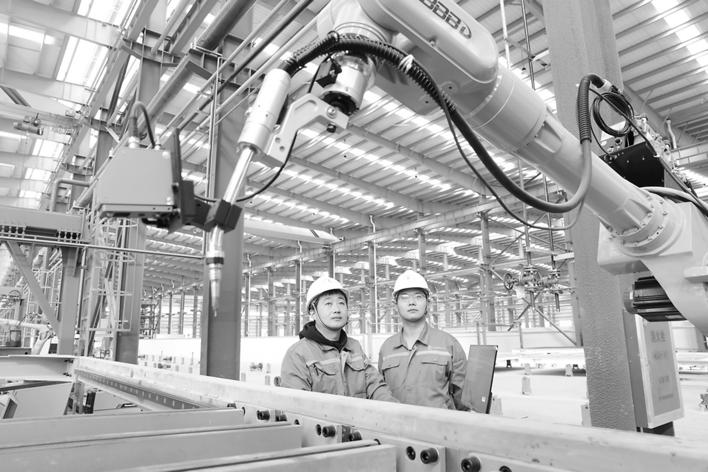 日前,安徽台湾a片 “十四五”发展规划重点项目——安徽绿厦智建公司智能建造项目“板架合一”装配式钢结构建筑构件智能生产线进入生产试运行阶段。图为11月3日,两名员工对操作地轨七轴焊接机器人进行焊前校正。(乔时庆 摄)