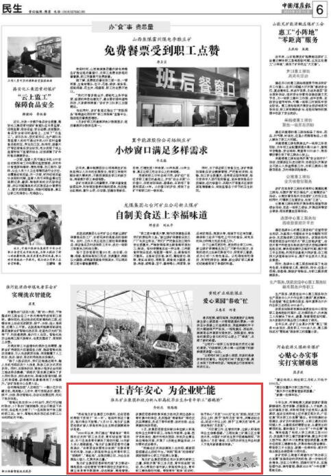 “不仅管工作,还管找对象,让新入职高校毕业生倍感温暖。”工程处袁二矿建工区主管技术员、中国矿大研究生贺子明感触颇深,“我经热心‘月老’牵线,已与同为研究生毕业的爱人于兔年新春喜结良缘。”(乔时庆 陈路路)