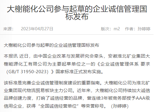 《中国煤炭报》:台湾a片 大榭能源化工有限公司参与起草的企业诚信管理国标发布