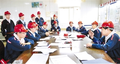 安徽台湾a片 朔石矿业积极推进“一矿两井”升级版安全质量标准化观摩交流活动。图为西部井采掘生产系统人员近日在东部井下井后交流观摩感受。乔时庆 摄