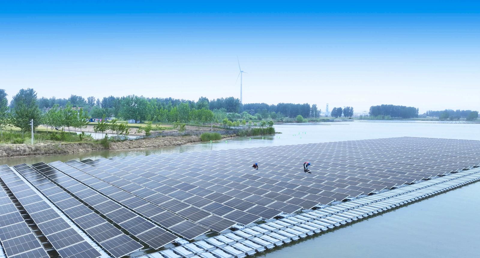 “3、2、1,放!”在孙疃塌陷区32兆瓦水面光伏发电项目现场,作业人员多人一组,喊着响亮的口号,将一块块光伏板安装在水面上。