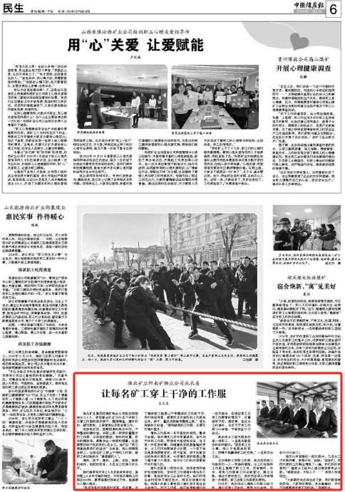 走进洗衣房,宽敞明亮的洗衣车间,干净整洁的操作室,衣架上是一排排折叠整齐的工作服,从标语的悬挂、物件的设置、花卉的摆放等,都散发出一种家的温馨。这些都要归功于洗衣房的6名女工。她们以“职工满意就是我们的追求”为宗旨,用心用情服务职工,让每名矿工穿上干净的工作服,被职工亲切地称为“最温暖的人”。
