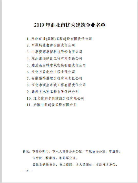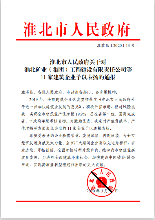 近日,淮北市人民政府下发了《关于对淮北矿业(集团)工程建设有限责任公司等11家建筑企业予以表扬的通报》,淮北矿业(集团)工程建设公司位居表扬榜首位。