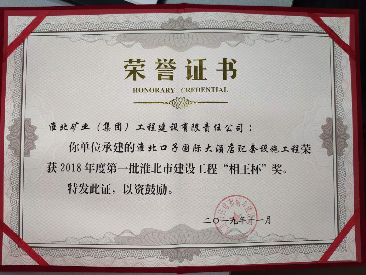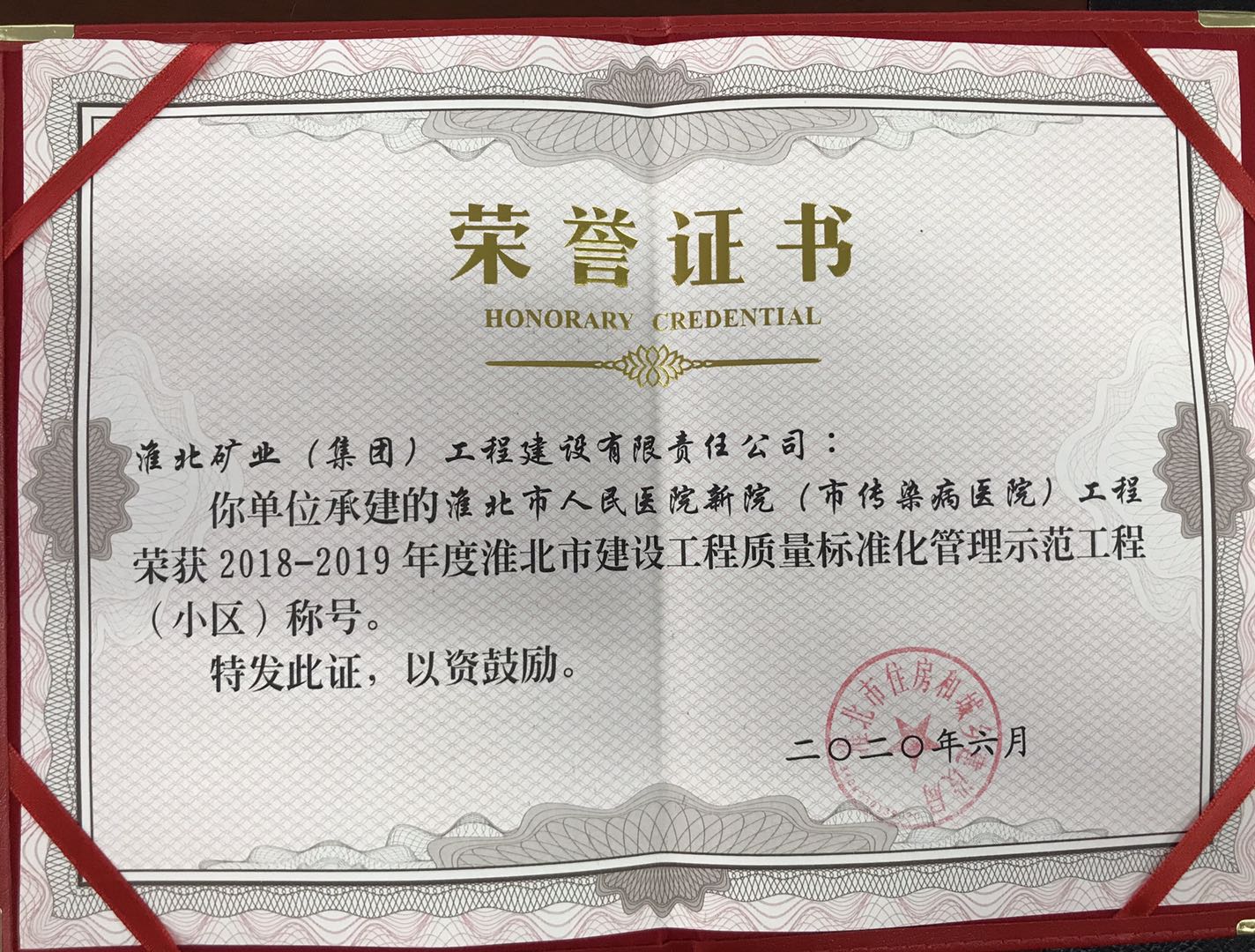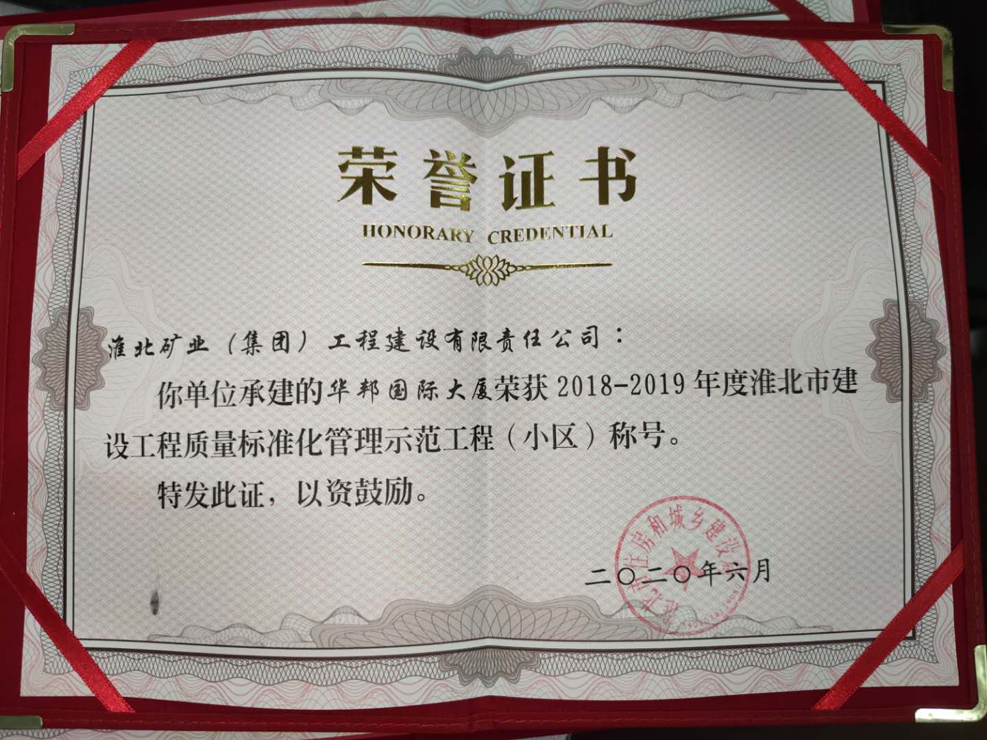 近日,工程建设公司承建项目在市级工程质量评比中捷报频传,由该公司承建的华邦国际大厦工程和淮北市人民医院新院(市传染病医院)工程同时获得2018~2019年度淮北市建设工程质量标准化管理示范工程,承建的淮北口子国际大酒店配套设施工程荣获2018年度第一批淮北市建设工程“相王杯”奖。