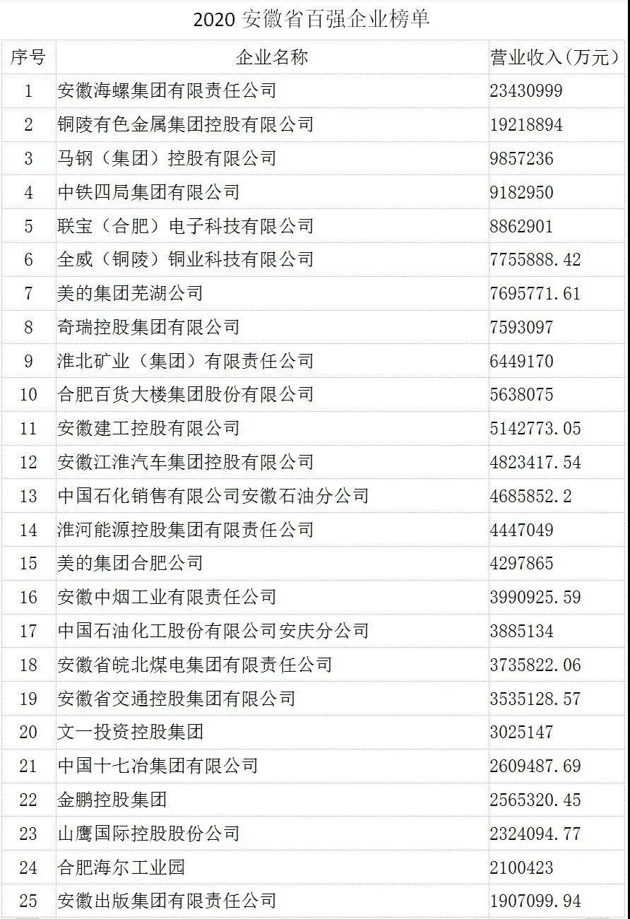 排序显示,安徽大企业“铁三角”格局未变:海螺集团、铜陵有色、马钢集团依然位列排序前三位。2019年,国内外经济增长低迷,国际经济贸易摩擦加剧,安徽省企业特别是以百强企业为代表的安徽省大企业,认真贯彻新发展理念,积极应对风险挑战,主动推动转型升级,发展壮大新动能,保持了稳健发展的态势。