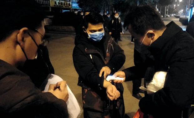 (2月13日,早上5点40时,淮北市,工作人员在为即将“出征”的职工检测体温)