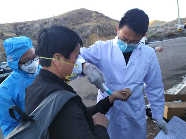 (2月14日,上午8点40分,鄂尔多斯市,范家村项目部防疫人员在为到岗职工检测体温)