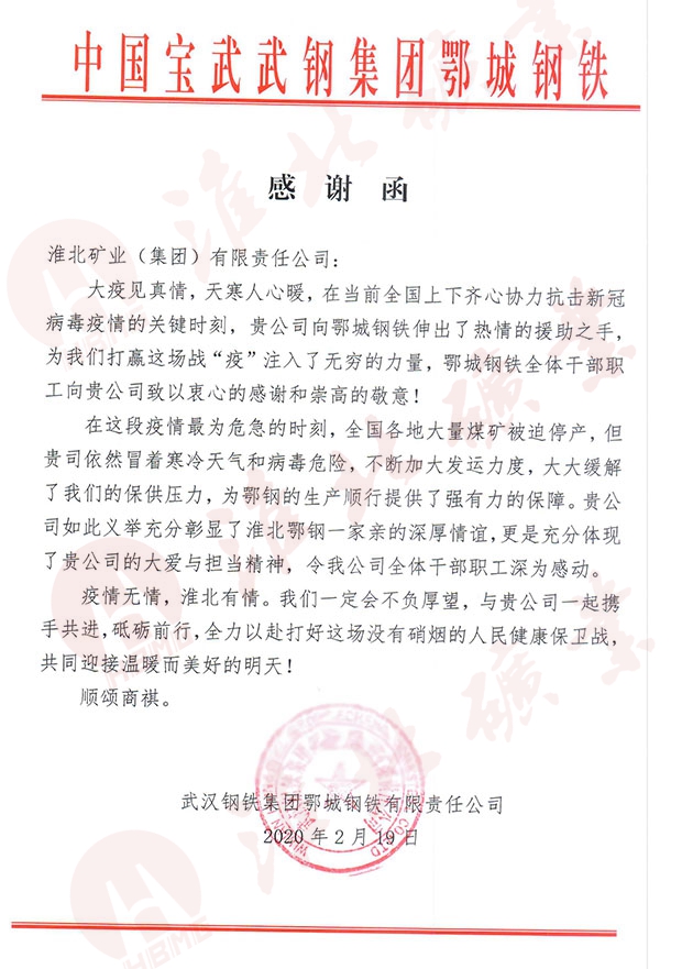 在得知这一情况后,冒着寒冷天气和病毒危险,不断加大精煤发运力度,大大缓解了武汉钢铁集团的保供压力,为鄂钢的生产顺行提供了强有力的保障,也为武汉打赢疫情防控阻击战提供了坚实的物质保障,彰显了淮北鄂钢一家亲的深厚情谊。武汉钢铁集团鄂城钢铁在感谢函中表示:“疫情无情,淮北有情。我们一定会不负厚望,与贵公司一起携手共进,砥砺前行,全力以赴打好这场没有硝烟的人民健康保卫战,共同迎接温暖而美好的明天!”