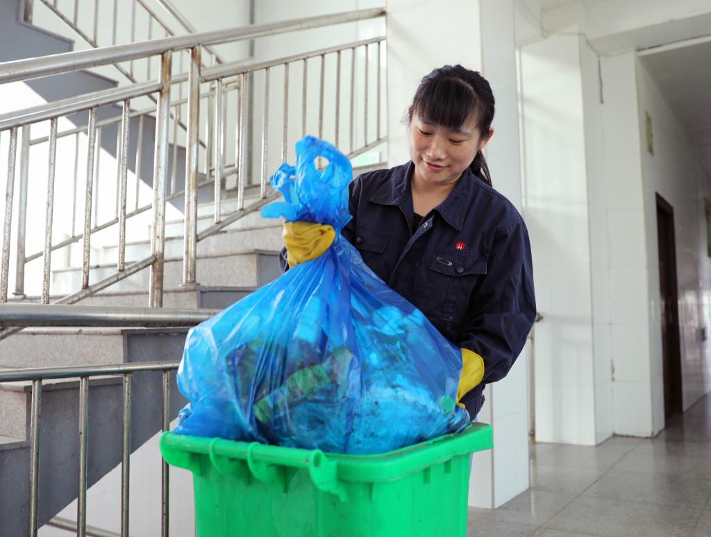 环å«å·¥é‡‘èŠé¦™æ£åœ¨æ¸…扫垃圾。“环境好了,心情也舒畅了,大伙干活也更有劲了,安全也更有ä¿éšœã€‚â€�