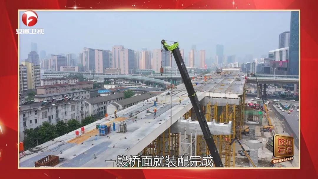 这里是位于安徽合肥的一个重要交通节点——南二环高架的施工现场,我们可以看到,提前在工厂里生产的钢梁正被一块块吊装起来,短短几个小时,一段桥面就装配完成�