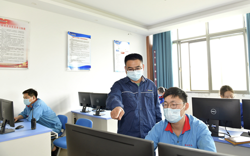 4月18日,临涣焦化公司专业技术人员利用化工仿真实训系统对新进大学生进行专业技能培训(杨天意 摄)