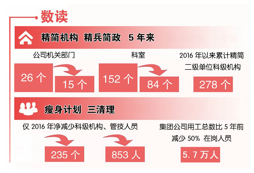 精简机构,精兵简政。5年来,实行公司机关大部制改革,机关部门由26个减至15个,科室由152个减至84个,2016年以来累计精减二级单位科级机构278个,两级机关更加精干高效。推广“一矿两井、一企多点、一人多岗”模式。2014年,对位置相近、资源相连的朔里矿井、石台矿井合并重组,压缩管理岗位和非生产岗位设置,成立朔石矿业公司,实行一套班子、一个机关管理,降低运行成本。2017年上半年,朔石矿业公司盈利7000万元。2016年,对海孜矿井和青东矿井合并成一个机构,压缩机构和管理岗位,降低管理成本,提高管理效能。