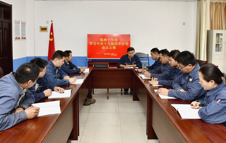 11�1日,临涣焦化公司炼焦一车间党支部组织党员认真学习中国共产党第十九届中央委员会第四次全体会议公报。当日,该公司党委发出通知,要求各党支部结合实际,组织党员认真学习宣传贯彻会议精神,为推进国家治理体系和治理能力现代化作出自己应有的贡献。(王明� 摄)
