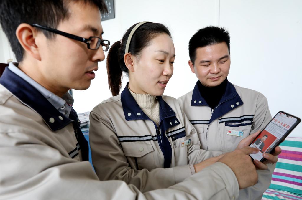 11�1日,童亭矿党群工作部人员通过电脑、手机客户端观看中国共产党第十九届中央委员会第四次全体会议公报。(高加� 摄)