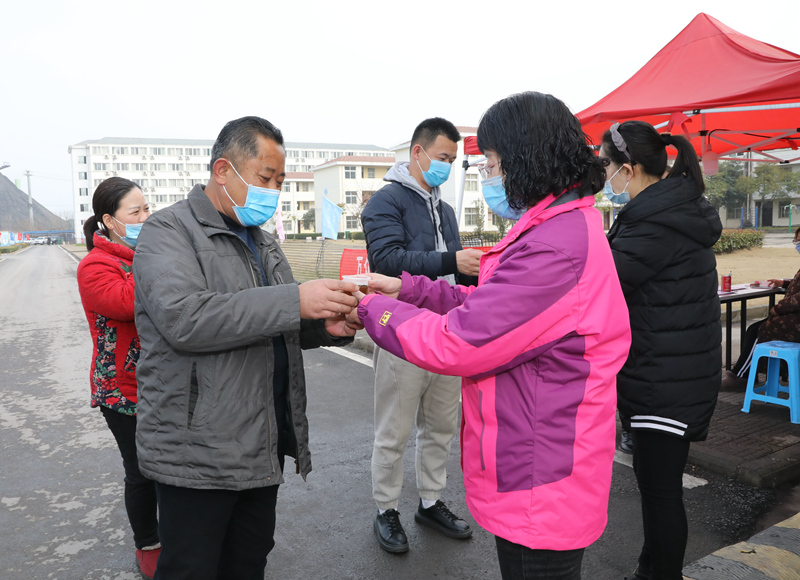 图为妇女协安员贴心的为上下班职工送上中药茶