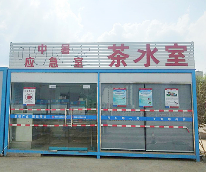 为了配合施工生产工作,提前做好高温酷热天气下的防暑降温工作,从入夏开始,工程建设公司就着手为在建项目施工现场的“茶水室”配备了空调,并在施工期间全程开放给工人使用。茶水室的外部还设置了“注意多喝水、常来歇歇腿”的温馨提示标语,内部张贴着通俗易懂、生动有趣的高温防中暑宣传画。除此之外,在醒目处专门设置了中暑应急救援药箱,让“茶水室”成了应急救援阵地,钱义海每次在“茶水室”休息时,抬头看看挂在墙上的救援药箱,心里都踏实,上房工作也更有信心了。