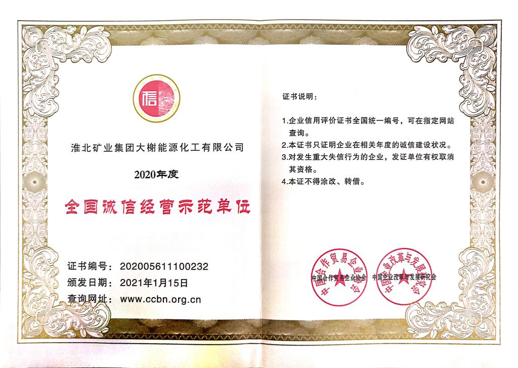 近期,由中国企业改革与发展研究会、中国合作贸易企业协会联合评定的《2020年度全国诚信经营示范单位》名单正式公布,大榭公司凭借长期以来在经济和信用建设工作中取得的突出成绩,被评选为“全国诚信经营示范单位”。