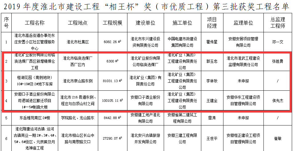 日前,淮北市住房和城乡建设局公布了2019年淮北市建设工程“相王杯”奖(市优质工程)获奖工程公示名单,由工程建设公司承建的淮北矿业股份有限公司临涣选煤厂西区新增精煤仓工程、桓湖花园(南侧地块)10#-19#及2#地下车库、安徽口子酒业股份有限公司退城进区搬迁项目 1#—5#制曲大楼等三项工程同时在列,成为获奖数量最多的施工单位。