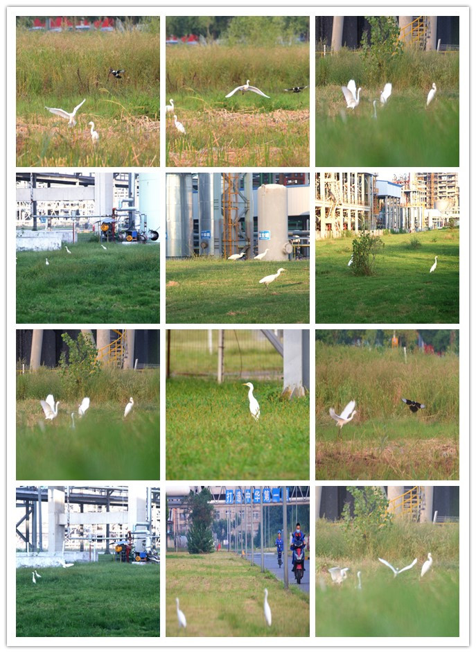在初秋湛蓝的天空中,它们成群结队,时而在管廊桥架上空盘旋,时而拍翅降落在绿化带上。它们扑扇着翅膀奔跑在水塘边的浅水里,把雪白的身影映在清澈的水面上。它们迈着长腿走在刚刚修剪过的草丛中,悠然自得,向人们展现自己独特的姿态,抑或昂头挺胸提起一只脚,用另一只脚站立张望马路上过往的车辆与行人。看样子,它们已经把这里当作休憩、生活的乐园。