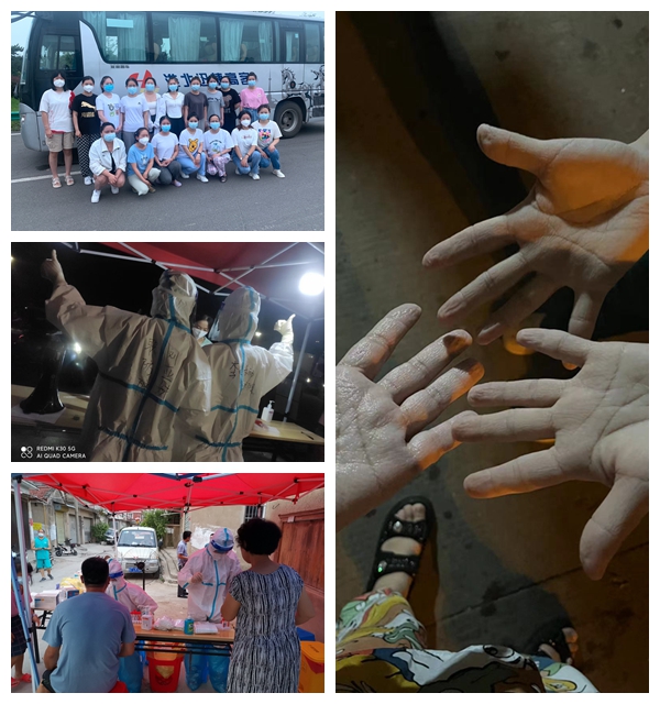 到达怀远后,检测队员便与病毒赛跑,争分夺秒进行核酸样本采集。在高温酷暑下,穿着密不透风的防护服,不能喝水,不能吃东西,不能上洗手间,脸被口罩勒出道道痕迹,衣服被汗水浸湿,手指变的皱白,但她们从未叫过一声苦、一声累。连续三天,当天核酸样本采集结束,当天赶回淮北的隔离酒店。面对疫情,她们时刻准备着冲锋,用自己的脚步和身影筑起抗击疫情的坚固防线。