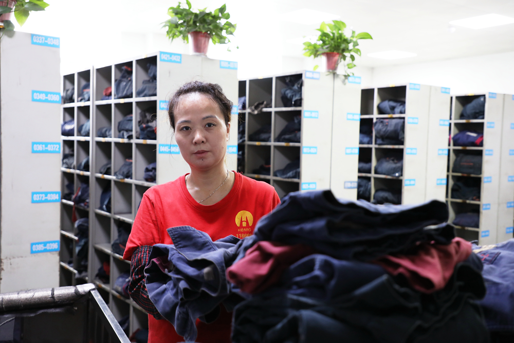张民,物业管理科洗衣房女工。她正在仔细整理叠放洗好的工作服,先甩、再折、三整、四放动作一气呵成、英姿飒爽。她说:“流程化的工作就要突出‘快’字,慢慢腾腾不是我们洗衣房姐妹们的性格。”