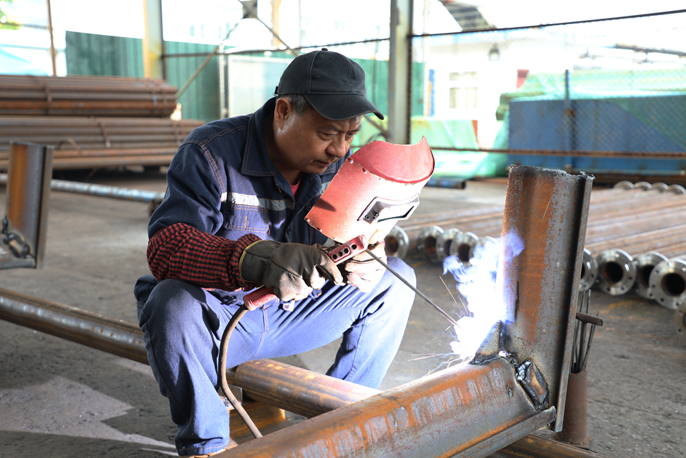 铆焊车间火光四射。当前该矿8205工作面正在铺网使棚,急需一批支护材料,机电科电焊工李一天不亮就投入到紧张的加工任务中,无怨无悔,有力保障了支护材料按时交付采区使用。