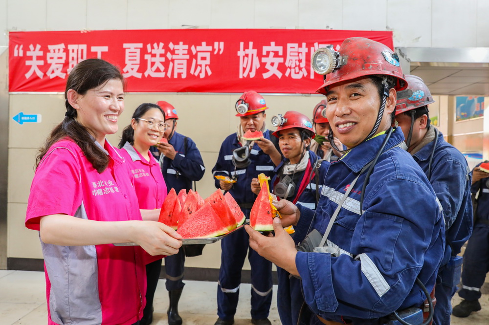 7月11日,农历入伏第一天,淮北地区最高气温超过35摄氏度,临涣矿把9000余斤西瓜、12000瓶盐汽水送到科区、班组、岗位,每人2件纯棉圆领衬衣发到干部职工手中,为全矿上下奋战“最热季”服务好。(撰稿:陈梦瑜 审核:刘辉)