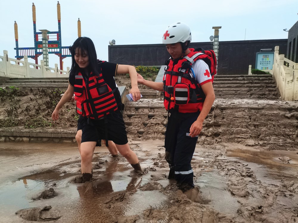 图为王雷(右一)帮助受灾群众转移