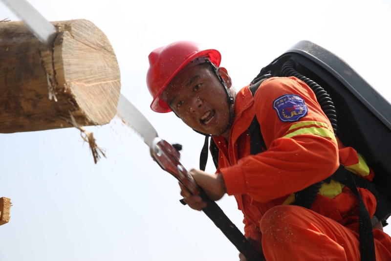 “5分10秒,无扣分项”,这是比武队集训1个月,队内测试“600米综合技能”项目时交出的成绩单。该项目包含爬绳、剪切、矮巷、坡道运送伤员、曲桥、翻轮胎、抛重物、佩戴呼吸器跑、锯木料9种课目,是检验救护队员在一定强度的体能消耗下,完成单兵技能操作的能力,并综合考查速度、爆发力、耐力、柔韧性、协调性及装备使用熟练程度等个人素质的综合项目。