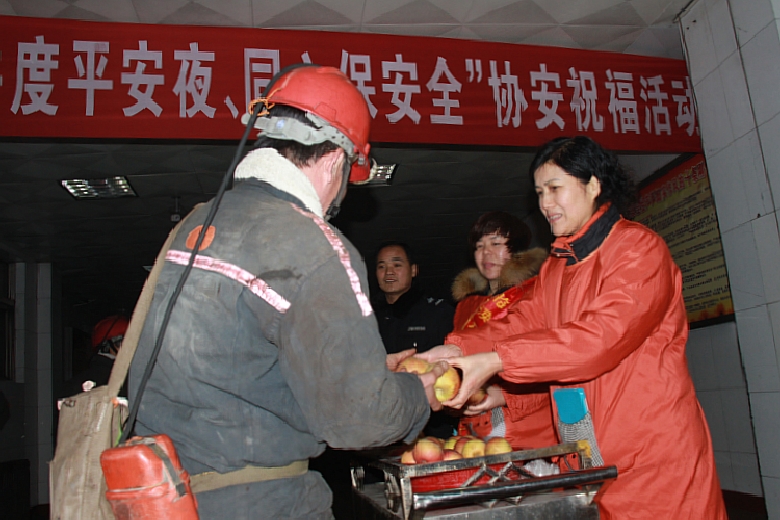 工会利用圣诞“平安夜”这个特殊日子,积极开展“送平安”亲情协安活动,组织妇女协安员提前购买了苹果,准备了毛巾、香皂等慰问品,早早运送到井口。在夜班交窑时间,安监处长张友根来到活动现场,与协安员们一起,为上下井的干部职工发放苹果和慰问品,并叮嘱他们一定要按章作业,搞好安全生产。