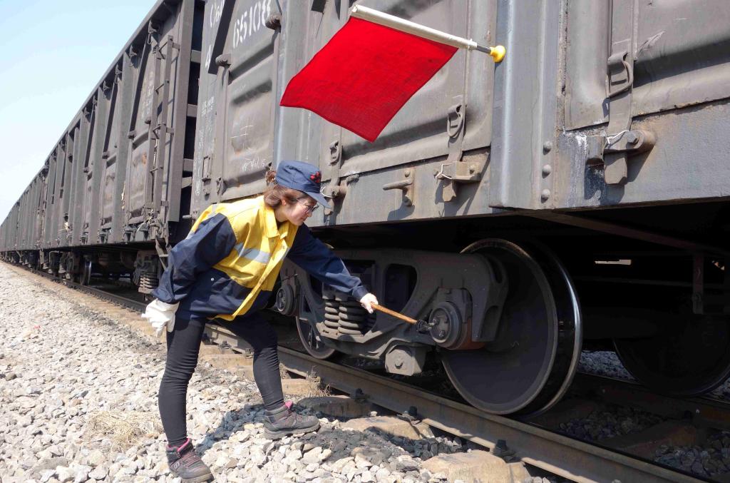 “三八”妇女节当天,淮北矿业“青年文明号—铁运处临涣机辆段女子列检班组”依然坚守岗位,默默奉献。该段女子列检员们各自忙碌着,有条不紊的排查检修每一台车辆,确保矿区煤炭运输安全、高效。图为:该段一名青年女子列检员正在检查车辆运用状态。(责编:徐成贵)