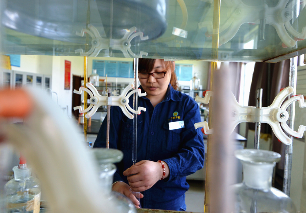 图为4月20日上午氯碱厂生产技术科一名职工在进行270碱浓度分析。(责编:徐成贵)