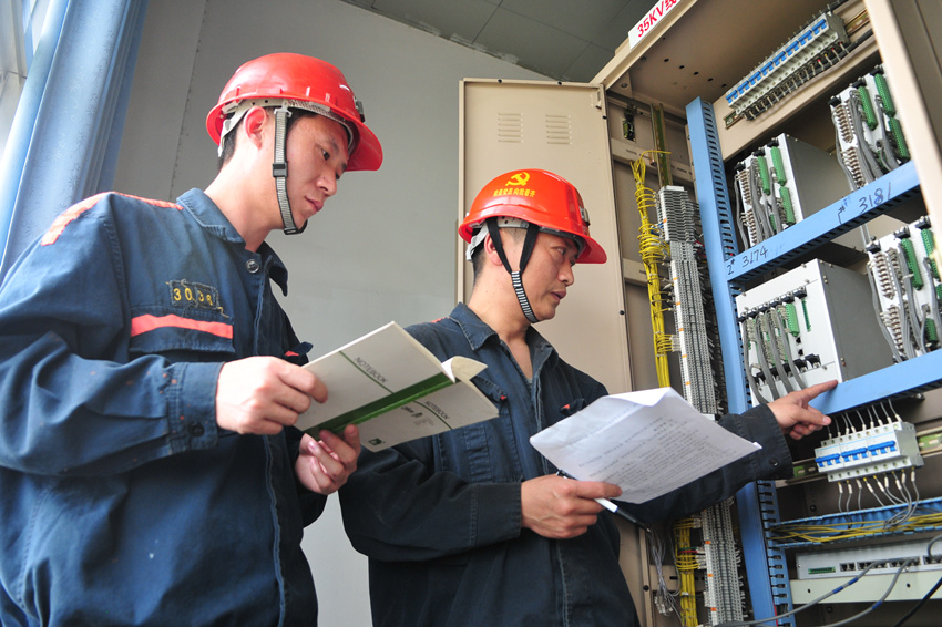 今年以来,袁店二矿启动操作技术“大拿”塑造工程,采取流动课堂、职工夜校、岗位练兵、技术比武等多元培训方式,着力打造高技能人才“孵化器”,加快实操技术人才培养,为矿井持续稳定发展提供人才支撑。图为4月19日,该矿保运区技术“大拿”杨正忠(右一)在向工友传授小电流接地线路系统排查技术要领。